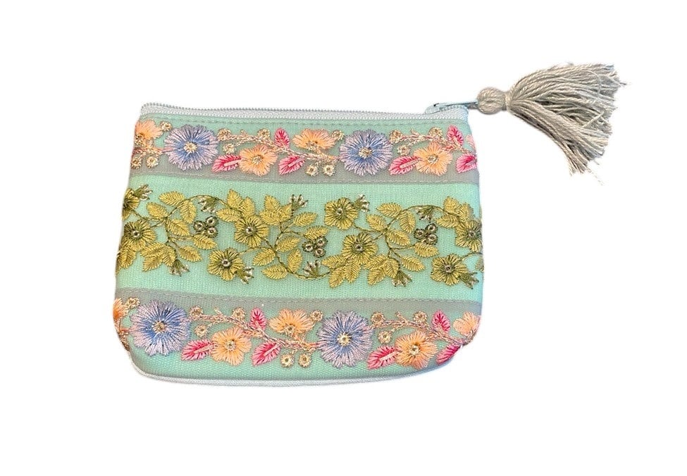 インド刺繍リボン・ ティッシュケース付ポーチ(グレイッシュブルー・ミントグリーン・ベーjジュ)